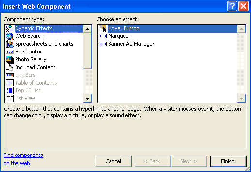 من أجل إضافة أزرار متحركة : 1- من Insert اختر Web Component لتفتح مربع حوار Insert Web Component اختر من Component Type أمر Dynamic Effects ومن Choose an effect اختر Hover Button ( الشكل 1 - 12 ) .