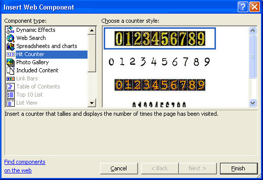 الشكل 2 - 12 ثانياً عداد الزيارة : من Insert اختر Web Component لتفتح مربع حوار Insert Web Component اختر من Component Type أمر Hit Counter ومن Choose a counter style اختر شكل العداد الذي ترغب به ( الشكل 3 - 12 ) .