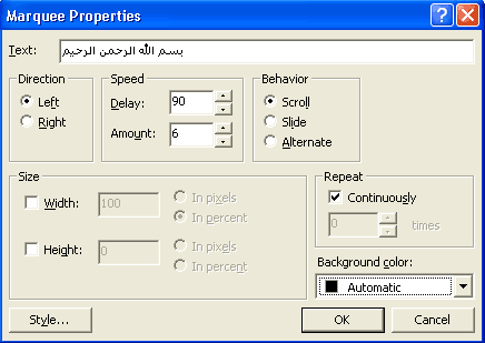 3 - 12 ثالثاً النص المتحرك : من Insert اختر Web Component لتفتح مربع حوار Insert Web Component اختر من Component Type أمر Dynamic Effects ومن Choose an effect اختر Marquee . وهنا يفتح مربع حوار Marquee properties الذي تستطيع من خلاله إضافة النص المتحرك إضافة إلى تطبيق التأثيرات الحركية واللونية المختلفة عليه ( الشكل 4 - 12 ) .