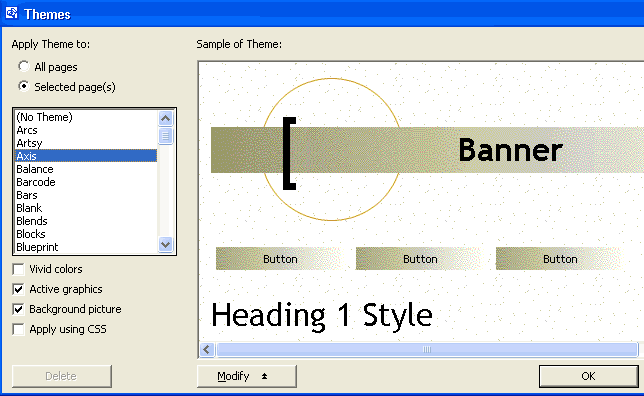 5 - 12 3- لتطبيق الفكرة العامة على موقع الويب بأكمله ، حدد زر الخيار All Pages الذي يوجد في جزء Apply Theme To لكن لتطبيقها على صفحات معينة ، فانقر زر الخيار Selected Page(s) l كما تستطيع أن تجعل الفكرة نطبق بكاملها أو بعض أجزائها من خلال الخيارات الموجودة أسفل أنواع الأفكار . 4-