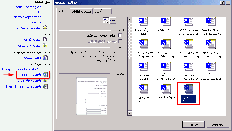 أنشئ موقعاً جديداً كما تعلمت في الدروس السابقة , ومن ثم من جديد اختر صفحة أو ويب ومن ثم قوالب الصفحة , من قوالب الصفحة اختر نموذج المعلومات أو formmail بالنسبة للفرونت بيج باللغة الإنكليزية ومن ثم موافق , الشكل ( 15 - 1 ) .